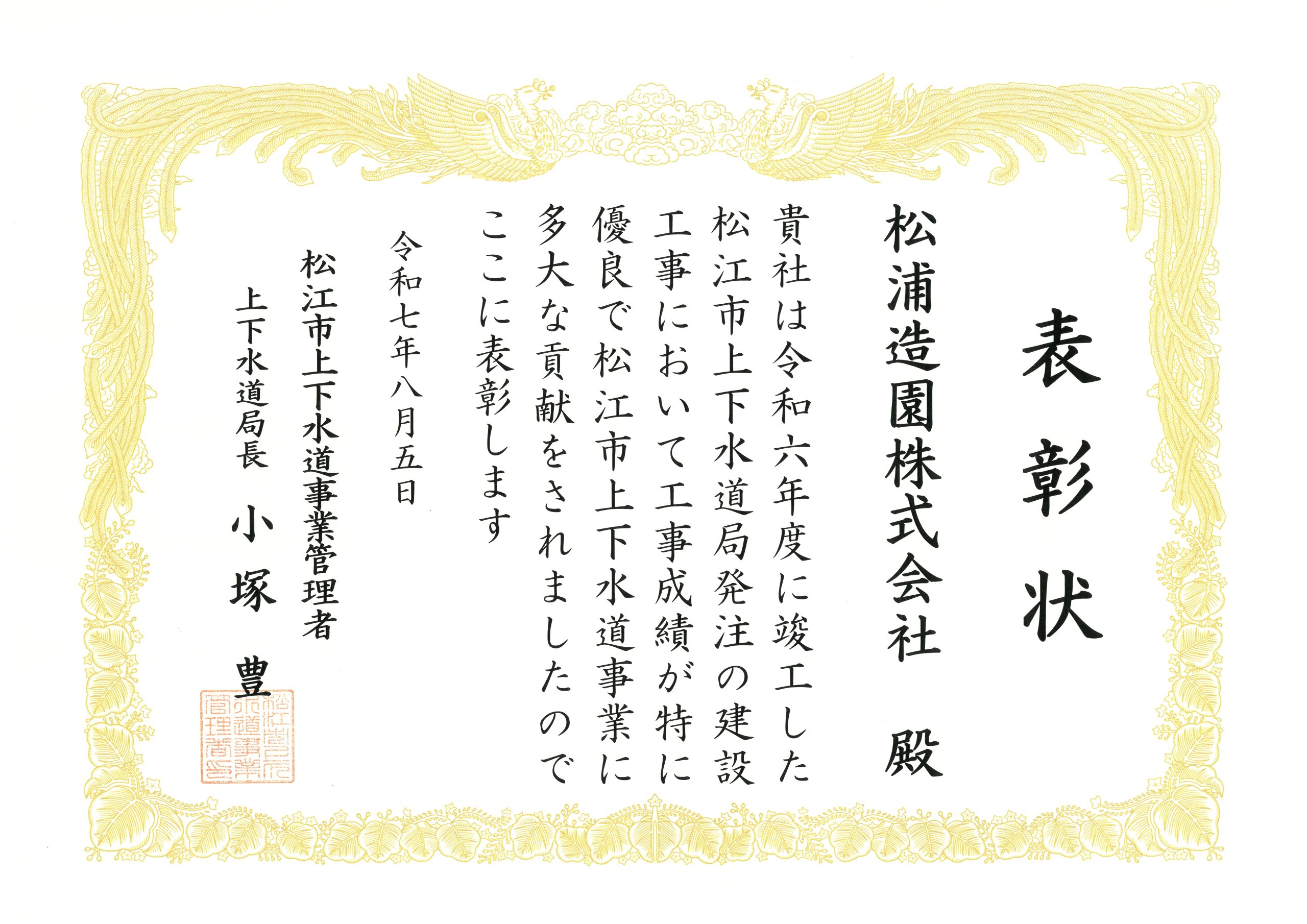 2025.08.05 第14回松江市上下水道局優良建設工事等表彰を受賞いたしました🏅